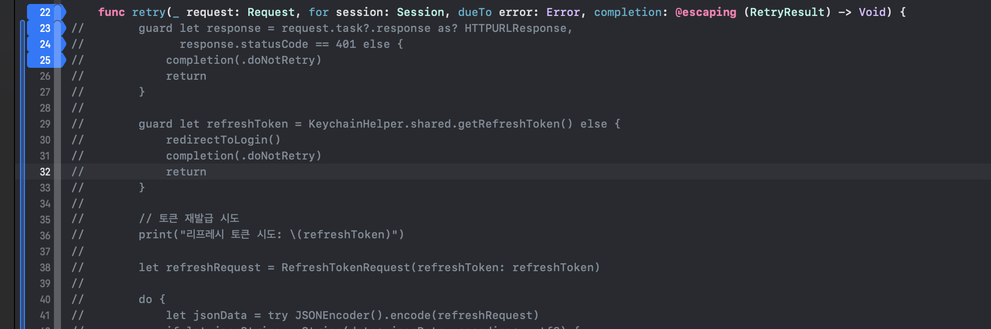 기존 retry 코드인데 지금은 좀 업그레이드 됐지만 토큰 재발급 로직도 제대로 넣어두었다. 클로드의 답변으로는 Task의 비동기 코드 블럭 내에서 completion를 호출하기에 그전에 retry 함수가 이미 끝나고 난 뒤라 적용이 안되는 것 같다고..