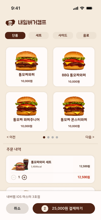 이 와이어프레임을 기준으로 컬렉션뷰로 표현할만한 컨텐츠가 뭐가 있느냐 하면 상단부터 카테고리, 버거 품목, 주문 내역 정도 있겠죠?