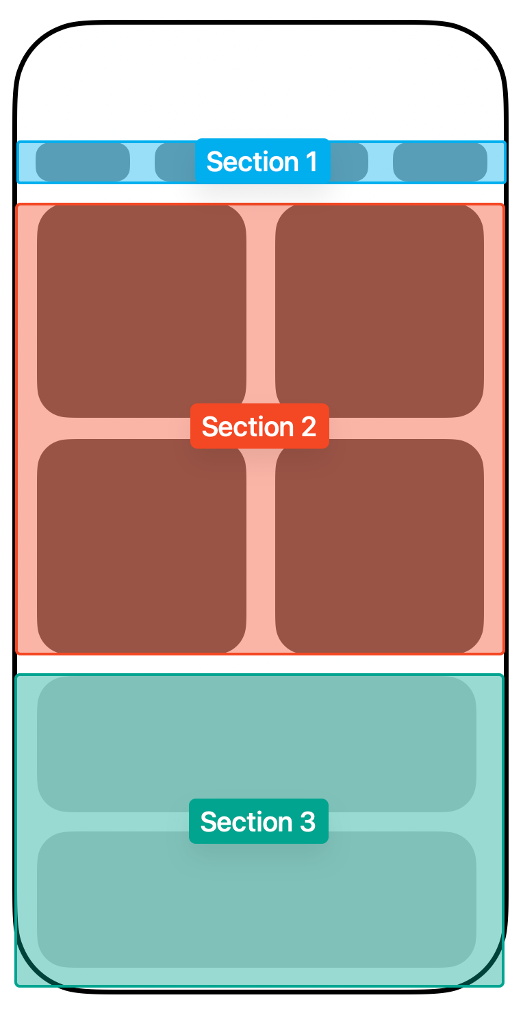 또 세 섹션 모두 셀의 레이아웃이 많이 다르다. 1행의 형태를 가지는 첫번째 섹션 그리고 2행의 형태를 가지는 두번째 섹션, 1열의 형태를 가지는 세번째 섹션. 각자 방향도 다르고 레이아웃도 많이 다르며 내부적으로 나름 헤더와 푸터도 가지는 섹션이 있어요.
