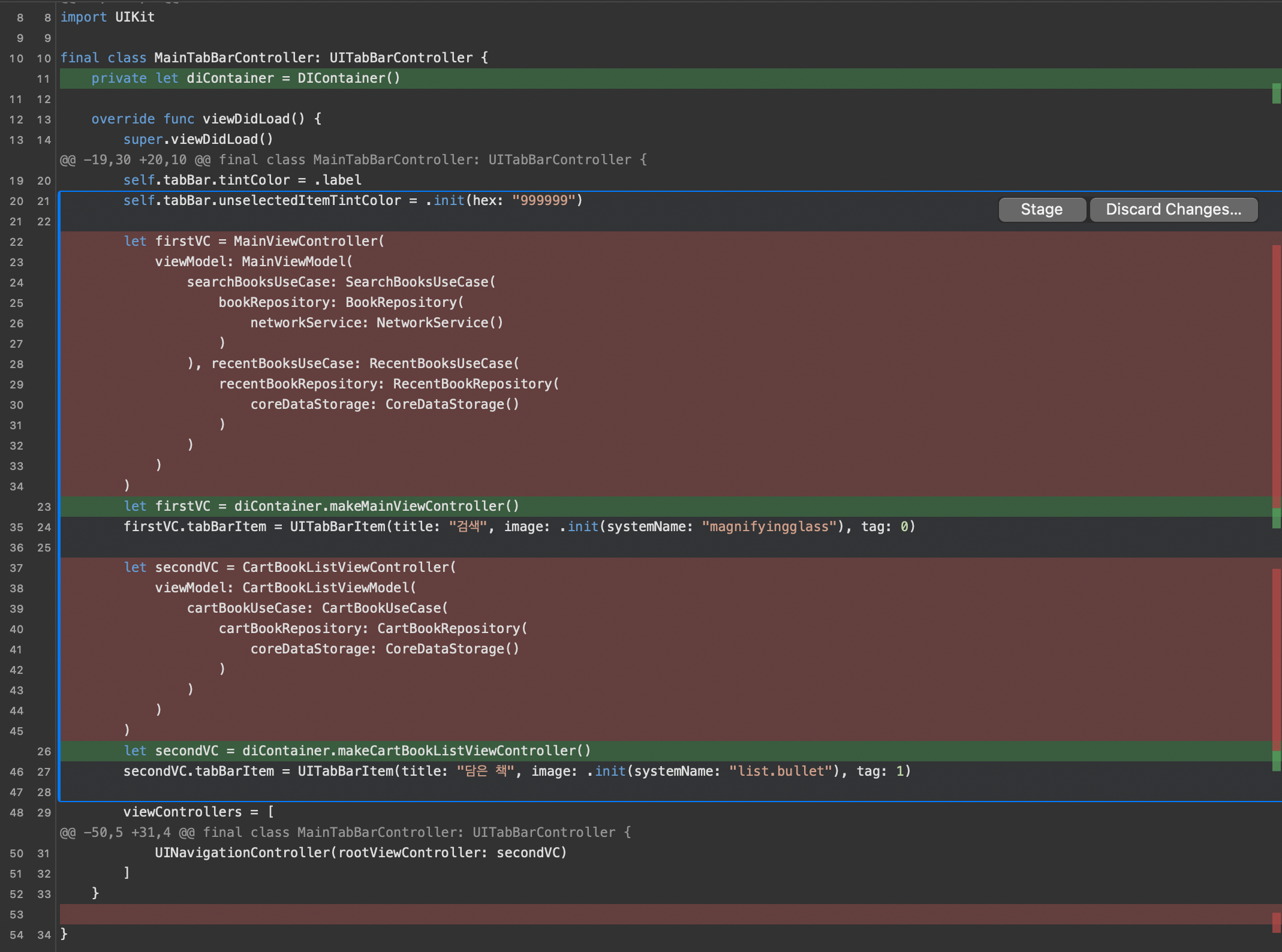 각 VC를 만들기 위해 그 안에 요소들을 만들어냈던 과정이 저 빨간 영역 내에 있는 코드에 있고, 이를 DIContainer로 일괄 관리를 하게 되면 저렇게 함수 하나 호출하면 길게 쓸 필요 없이 관리가 가능하다.